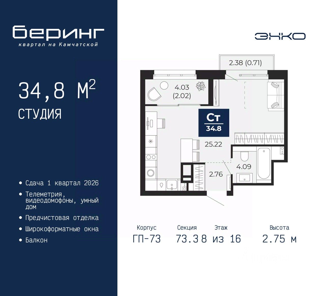Продается 1-комн. квартира-студия с предчистовой отделкой в ЖК ''Беринг'' на 8 этаже. Общая площадь: 34.8 кв.м., площадь гостиной 25.22 кв.м., из которых 5 кв.м. выделено под кухонную зону. Все окна выходят на одну сторону. В квартире один балкон, один совмещенный санузел. Высота потолков 2.75 м.