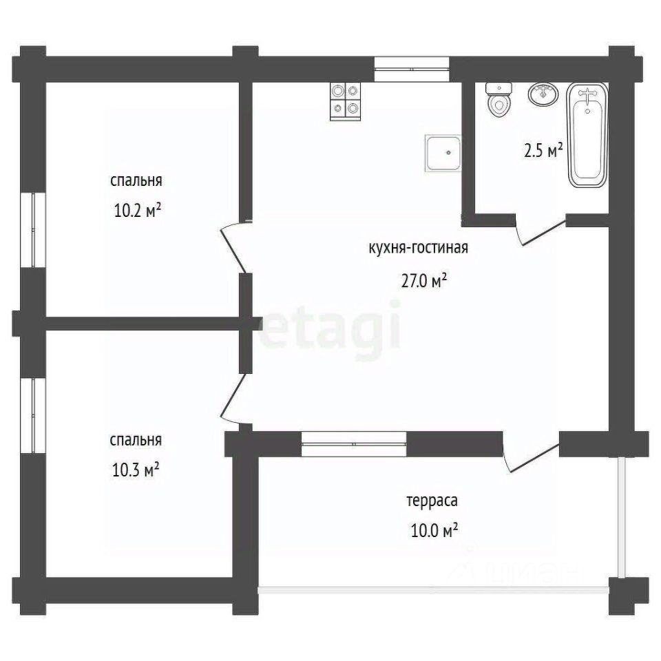 О ДОМЕ: Дом выполнен из профилированного бруса. Перекрытия утеплены - базальтовая вата 150мм. Площадь дома 60 кв.м. Комфортная планировка 2+ с просторной кухней-гостиной с выходом на террасу.