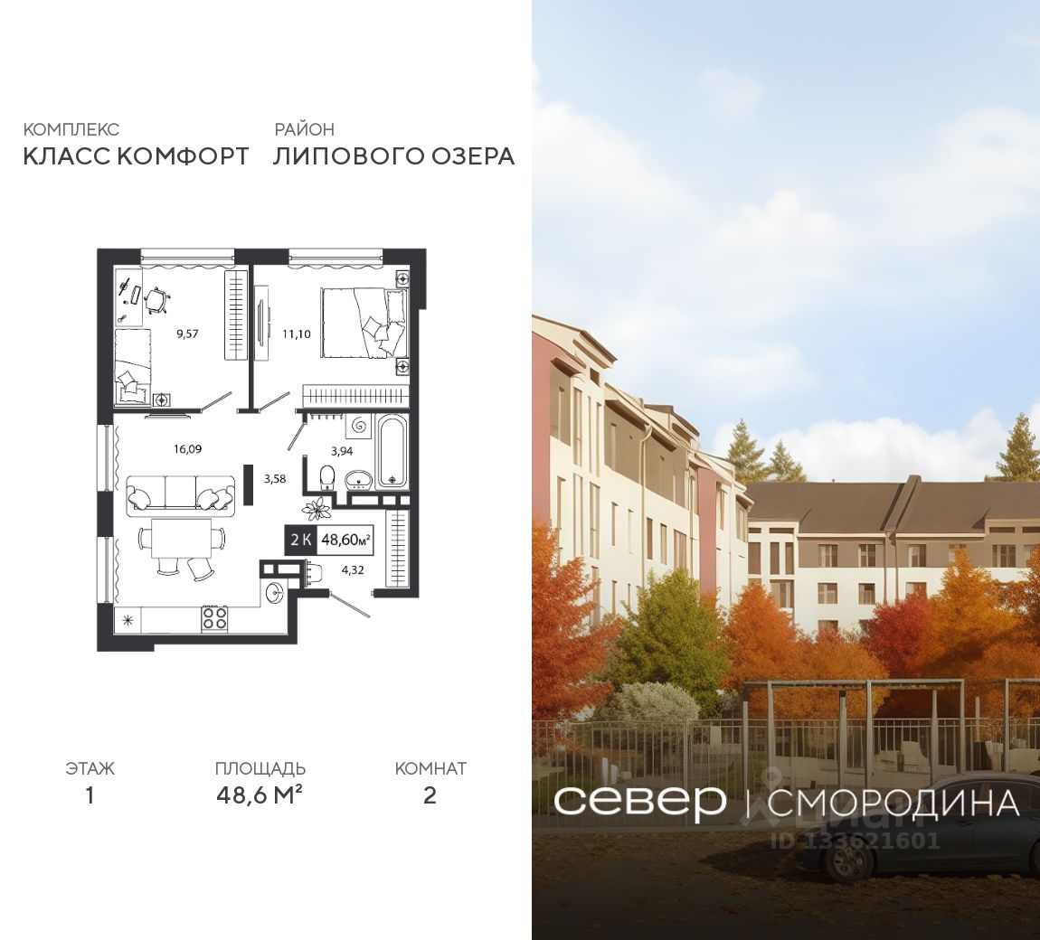 Продаётся квартира площадью 48.6 м2 в жилом комплексе ''Смородина''. Квартира находится на 1 этаже, жилая площадь квартиры 20.67 м2, площадь просторной кухни — 16.09 м2. Среди особенностей планировки — изолированные комнаты с окнами на одну сторону, 1 совмещённый санузел.