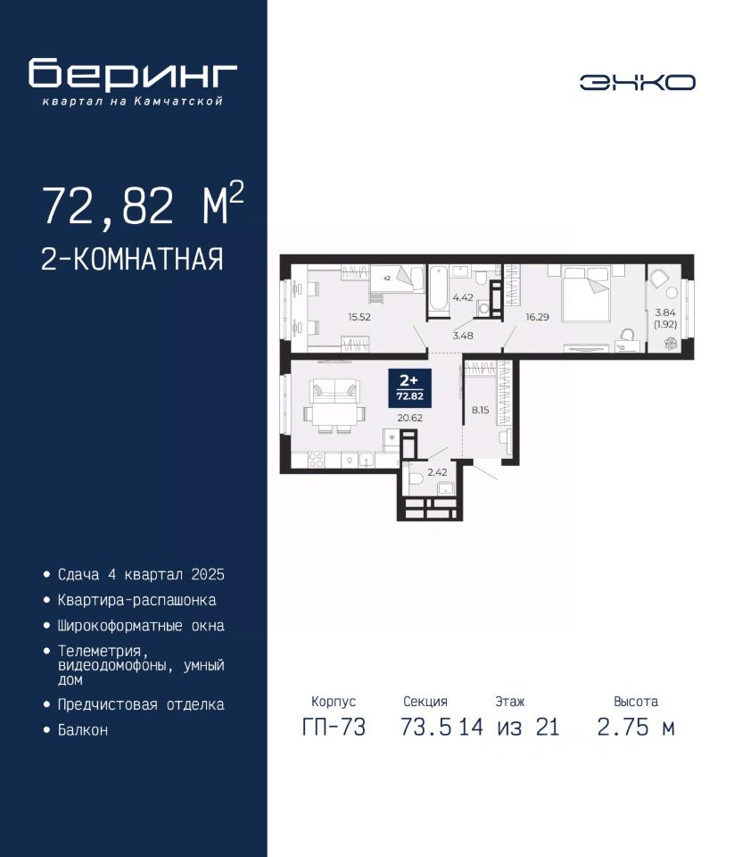 Продается 2-комн. квартира от застройщика с предчистовой отделкой в ЖК ''Беринг'' на 14 этаже. Общая площадь: 72.82 кв.м., жилая: 31.81 кв.м., площадь просторной кухни-столовой: 20.62 кв.м. Квартира - распашонка, без проходных комнат, окна выходят на paзные стороны дома. В квартире один балкон, один совмещенный и один раздельный санузел. Высота потолков 2.75 м.