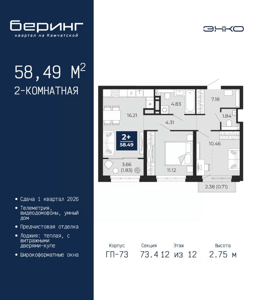 Продается 2-комн. квартира с предчистовой отделкой в ЖК ''Беринг'' на 12 этаже. Общая площадь: 58.49 кв.м., жилая: 21.58 кв.м., площадь просторной кухни-столовой: 16.21 кв.м. Комнаты изолированные, все окна выходят на одну сторону. В квартире один балкон и одна лоджия, один совмещенный и один раздельный санузел. Высота потолков 2.75 м.