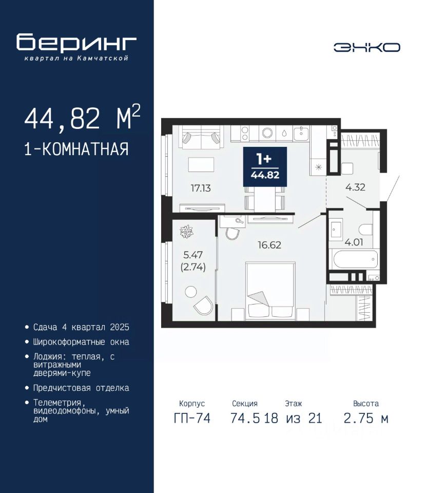 Продается 1-комн. квартира с предчистовой отделкой в ЖК ''Беринг'' на 18 этаже. Общая площадь: 44.82 кв.м., жилая: 16.62 кв.м., площадь просторной кухни-столовой: 17.13 кв.м. Все окна выходят на одну сторону. В квартире одна лоджия, один совмещенный санузел. Высота потолков 2.75 м.