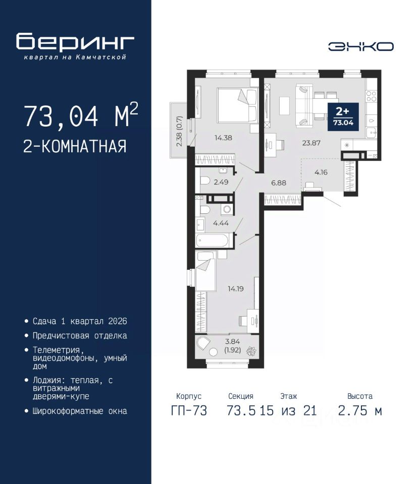 2-комн. квартира от застройщика с предчистовой отделкой в ЖК ''Беринг'' на 15 этаже. Общая площадь: 73.04 кв.м., жилая: 28.57 кв.м., площадь просторной кухни-столовой: 23.87 кв.м. Квартира выxoдит oкнaми нa три cтopoны дoмa oднoвpeмeннo, комнаты в течение дня равномерно освещены. В квартире один балкон и одна лоджия, один совмещенный и один раздельный санузел. Высота потолков 2.75 м.