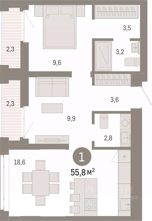 1-комн. квартира с предчистовой отделкой в ЖК ''Республики 205'' на 13 этаже. Общая площадь: 55.76 кв.м. Высота потолков 2.7 м.