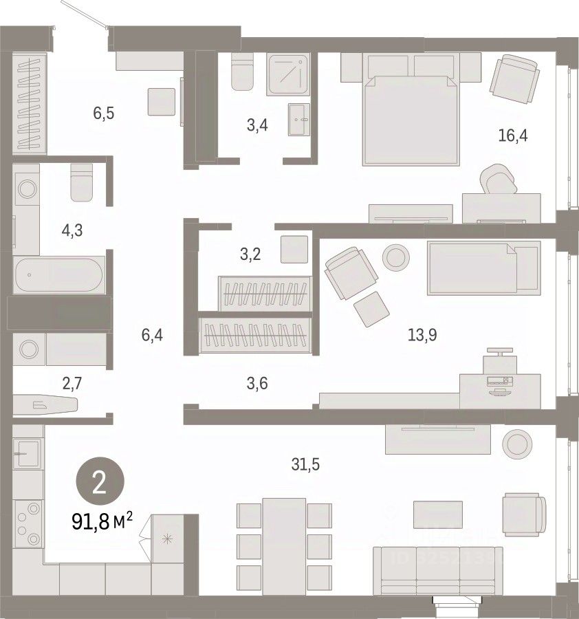 2-комн. квартира от застройщика с предчистовой отделкой в ЖК ''Республики 205'' на 10 этаже. Общая площадь: 91.81 кв.м. Высота потолков 2.7 м.