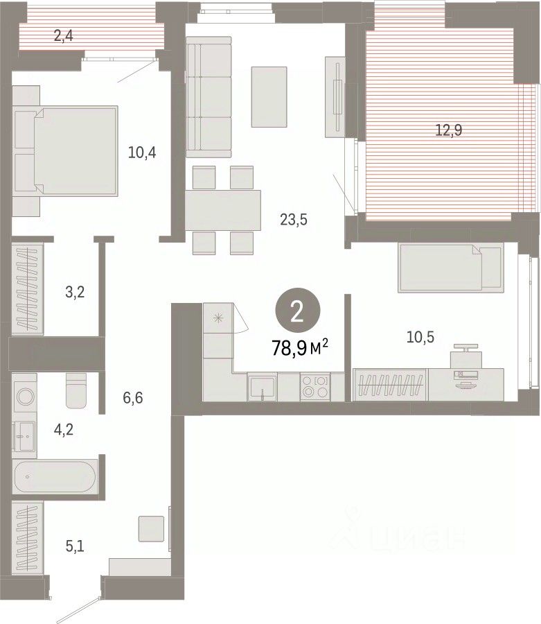 Двухкомнатная квартира с предчистовой отделкой в ЖК ''Республики 205'' на 16 этаже. Общая площадь: 78.89 кв.м. Высота потолков 2.7 м.