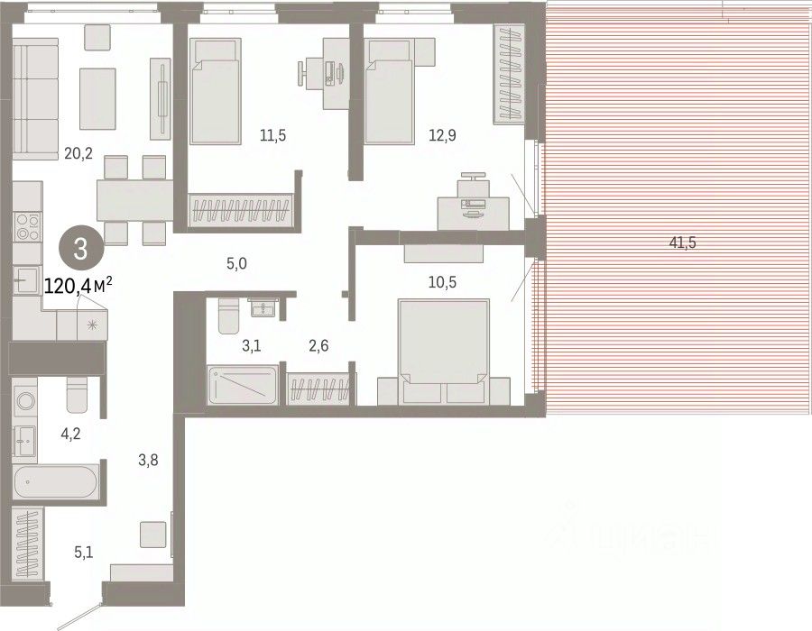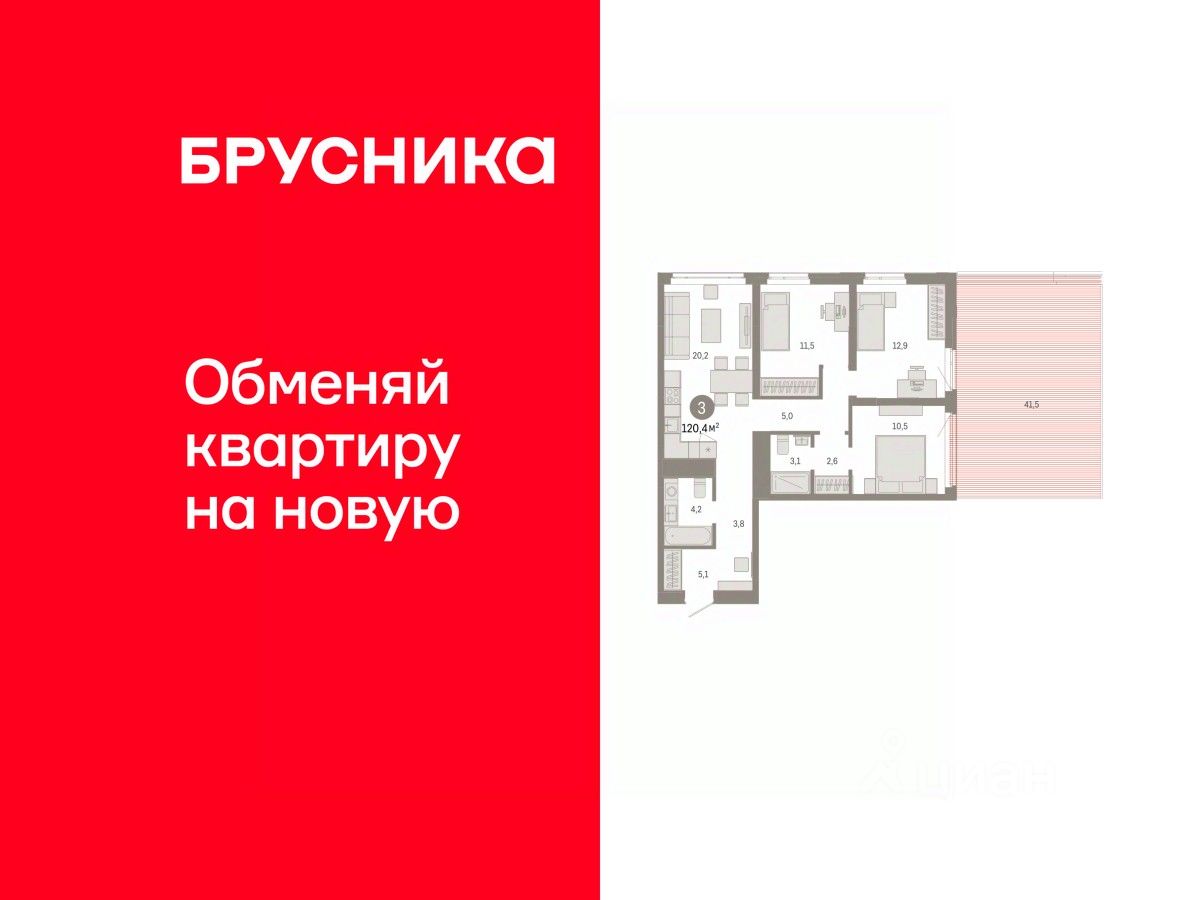 Трехкомнатная квартира с предчистовой отделкой в ЖК ''Республики 205'' на 3 этаже. Общая площадь: 120.38 кв.м. Высота потолков 2.7 м.