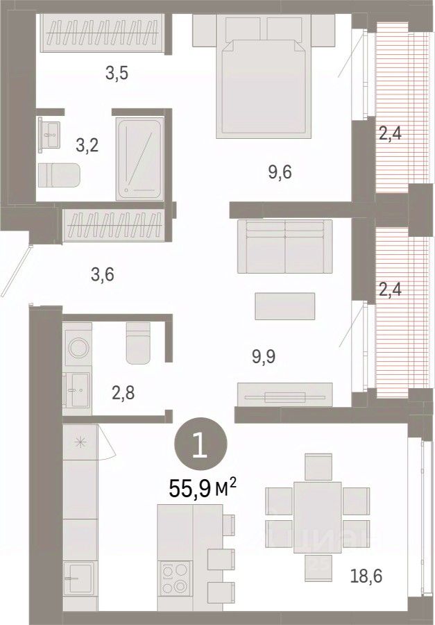 Просторная однокомнатная квартира с предчистовой отделкой в ЖК ''Республики 205'' на 12 этаже. Общая площадь: 55.94 кв.м. Высота потолков 2.7 м.