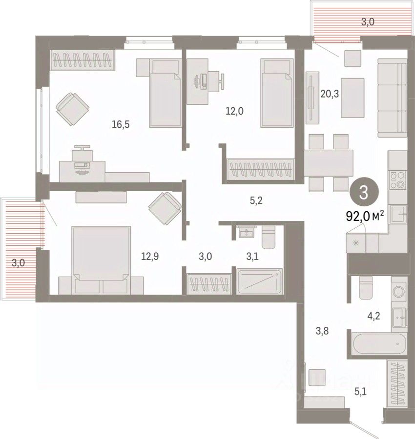 Просторная 3-комн. квартира с предчистовой отделкой в ЖК ''Республики 205'' на 7 этаже. Общая площадь: 91.98 кв.м. Высота потолков 2.7 м.