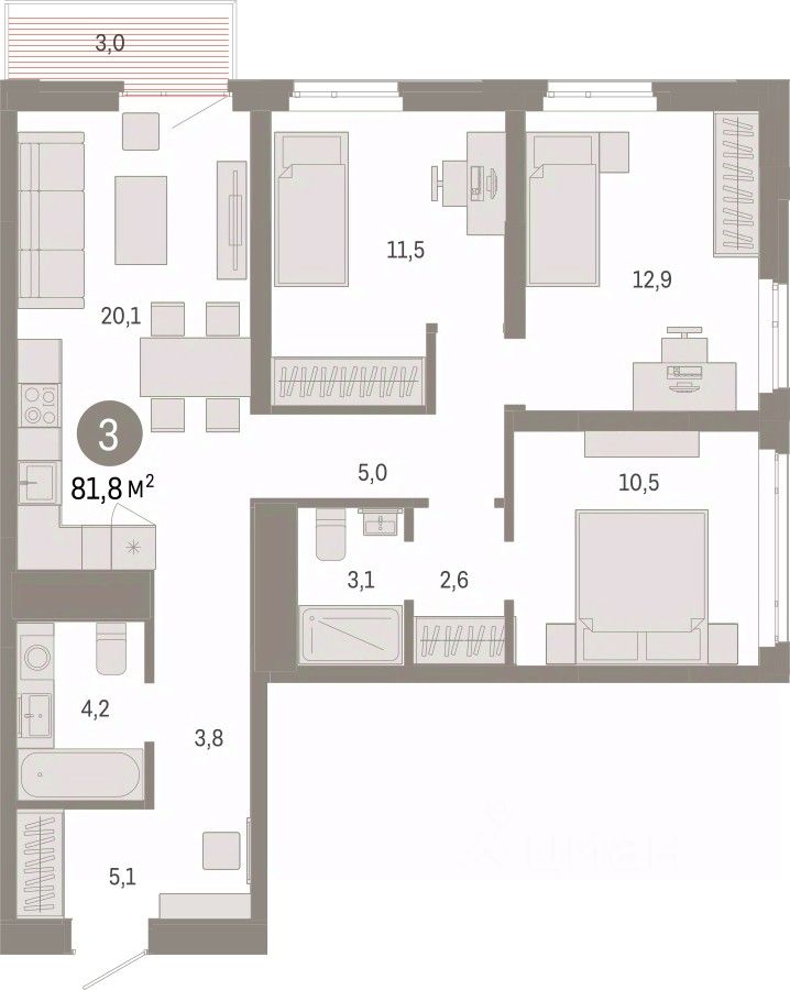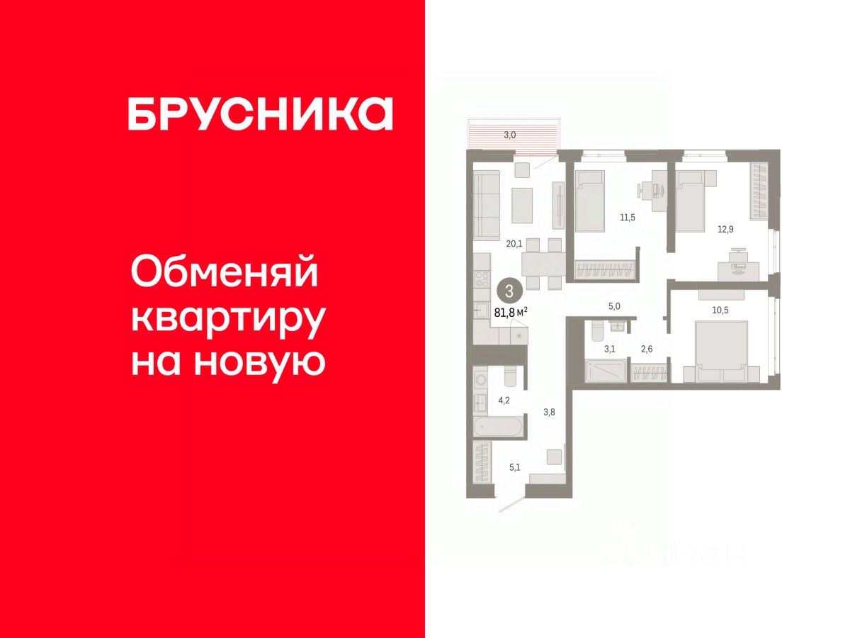 3-комн. квартира с предчистовой отделкой в ЖК ''Республики 205'' на 5 этаже. Общая площадь: 81.8 кв.м. Высота потолков 2.7 м.