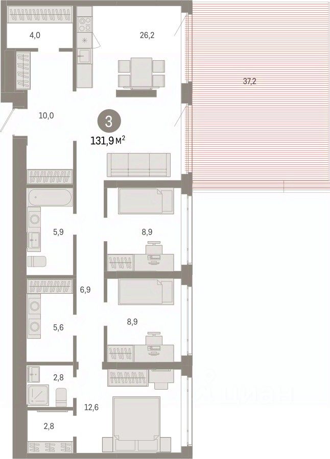 3-комн. квартира с предчистовой отделкой в ЖК ''Республики 205'' на 3 этаже. Общая площадь: 131.89 кв.м. Высота потолков 2.7 м.