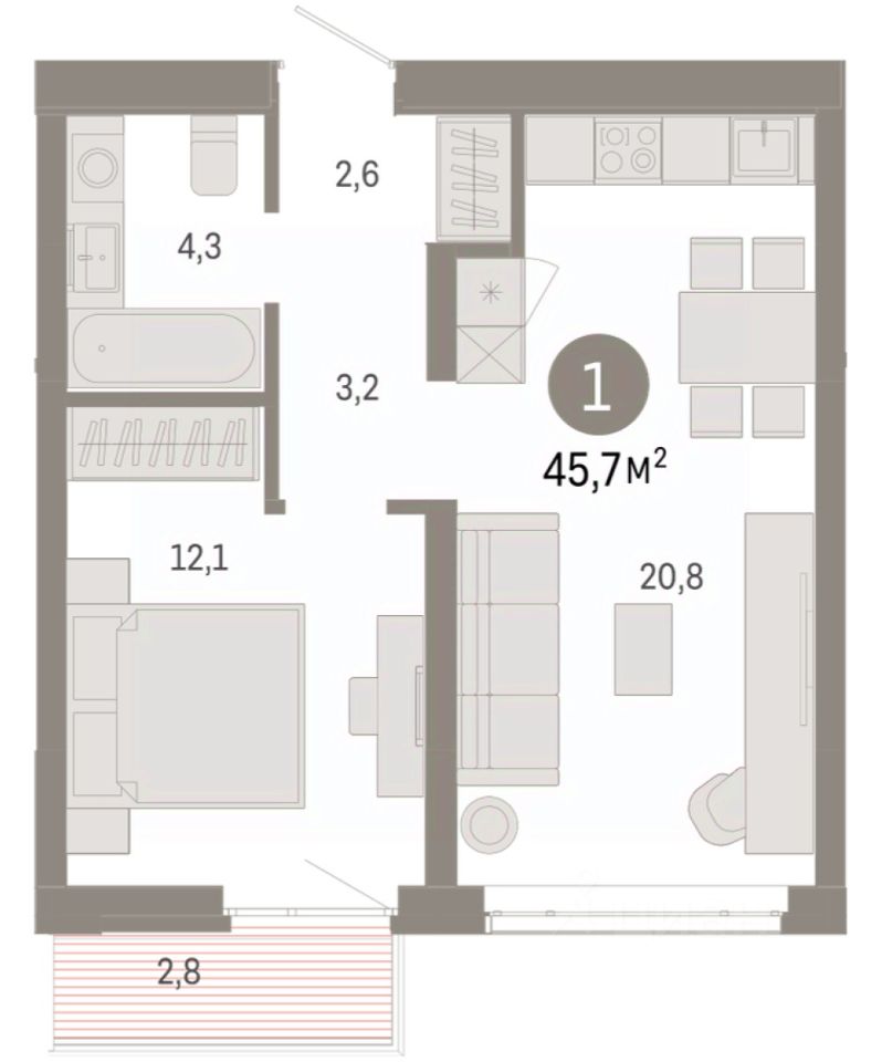 Продается 1-комн. квартира от застройщика с предчистовой отделкой в ЖК ''Республики 205'' на 7 этаже. Общая площадь: 45.77 кв.м. Высота потолков 2.7 м.