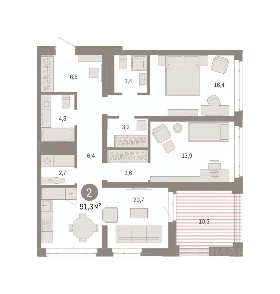 Просторная 2-комн. квартира с предчистовой отделкой в ЖК ''Республики 205'' на 17 этаже. Общая площадь: 91.26 кв.м. Высота потолков 2.7 м.