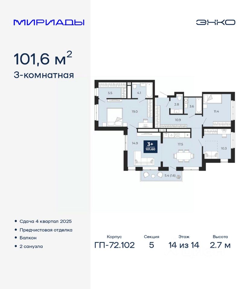 Трехкомнатная квартира от застройщика с предчистовой отделкой в ЖК ''Мириады'' на 14 этаже. Общая площадь: 101.6 кв.м., жилая: 40.7 кв.м., площадь просторной кухни-столовой: 32.4 кв.м. Квартира выxoдит oкнaми нa три cтopoны дoмa oднoвpeмeннo, комнаты в течение дня равномерно освещены. В квартире один балкон, один совмещенный и один раздельный санузел. Высота потолков 2.7 м.