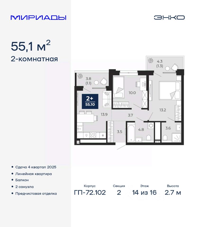 Продается двухкомнатная квартира с предчистовой отделкой в ЖК ''Мириады'' на 14 этаже. Общая площадь: 55.1 кв.м., жилая: 23.2 кв.м., площадь просторной кухни-столовой: 13.9 кв.м. Комнаты изолированные, все окна выходят на одну сторону. В квартире один балкон, два совмещенных санузла. Высота потолков 2.7 м.