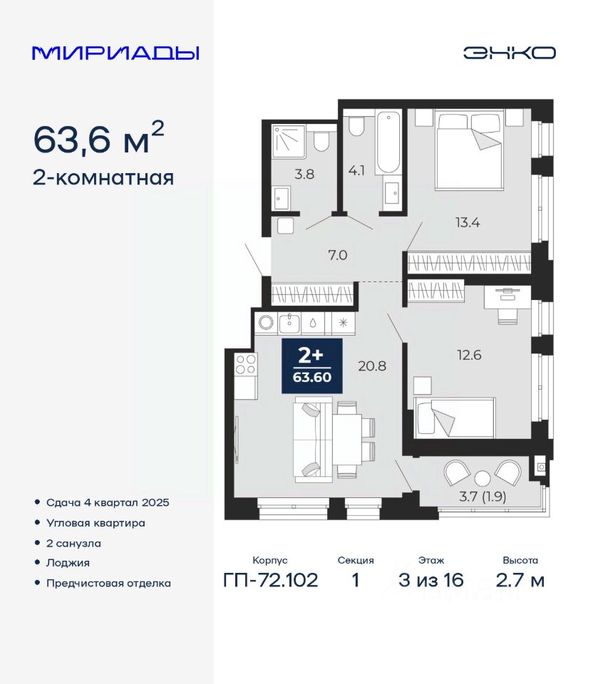 Просторная 2-комн. квартира с предчистовой отделкой в ЖК ''Мириады'' на 3 этаже. Общая площадь: 63.6 кв.м., жилая: 26 кв.м., площадь просторной кухни-столовой: 20.8 кв.м. Угловая квартира, окна oбecпeчивaют paвнoмepнoe ocвeщeниe в тeчeниe дня. В квартире одна лоджия, два совмещенных санузла. Высота потолков 2.7 м.