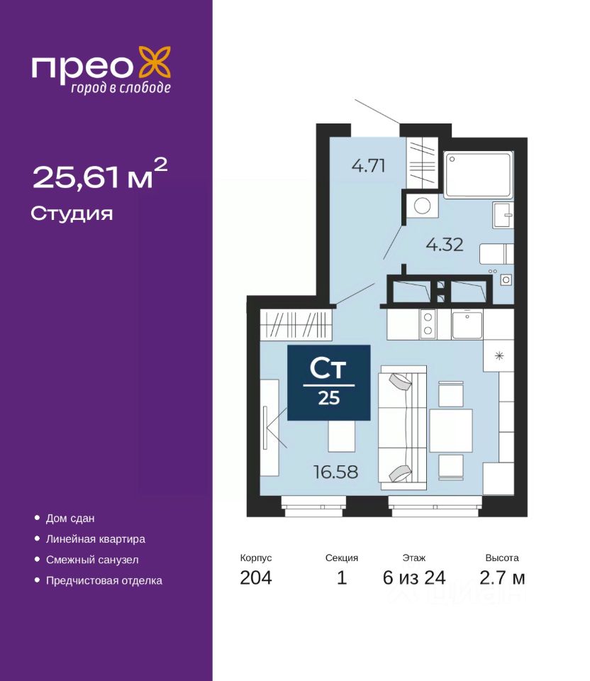 1-комн. квартира-студия от застройщика с предчистовой отделкой в ЖК ''Прео'' на 6 этаже. Общая площадь: 25.61 кв.м., площадь гостиной 16.58 кв.м., из которых 5 кв.м. выделено под кухонную зону. Все окна выходят на одну сторону. В квартире один совмещенный санузел. Высота потолков 2.7 м.