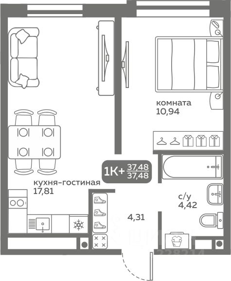 Прямая продажа от застройщика! Продается однокомнатная квартира в строящемся ЖК ''Меридиан Слобода'', срок сдачи: I-кв. 2027, общей площадью 37.48 м², на 3 этаже из 20. Площадь кухни — 17.81 м².