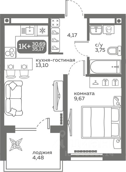 Прямая продажа от застройщика! Продается однокомнатная квартира в строящемся ЖК ''Меридиан Слобода'', срок сдачи: I-кв. 2027, общей площадью 30.69 м², на 4 этаже из 20. Площадь кухни — 13.1 м².