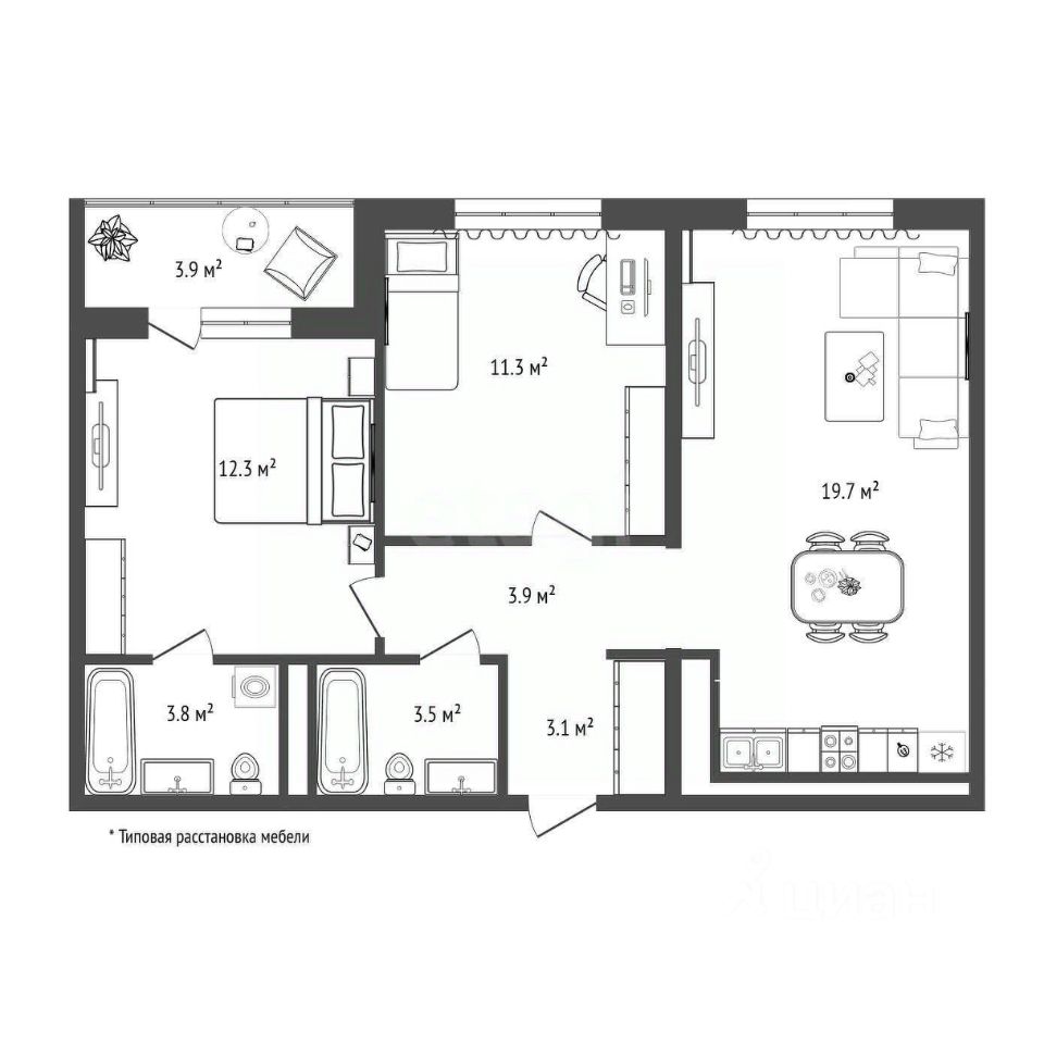 Планировка точная и разумная — как хороший мотив: просторная кухнягостиная 19,7 м², где удобно собирать гостей и одновременно готовить, две правильной формы комнаты 12,3 и 11,3 м² — одна из них легко становится мастерспальней, другая — детской или камерным кабинетом. Два санузла (приблизительно 3,8 и 3,5 м²) — редкая приятность в городской квартире, лоджия/балкон 3,9 м² даёт дополнительную интимную террасунишу для растений и утра с чашкой кофе. Прихожие и ниши продуманы для хранения — место для аккуратного гардероба и техники, ничего не мешает глазу и движению. Планировка по сути — ''игра на контрастах'': простор для общения и уют для уединения, всё по правилам современной жизни.