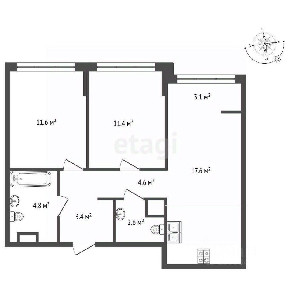 Внутреннее пространство квартиры включает в себя просторную кухню-гостиную, две отдельные спальни и два санузла. Один из санузлов можно легко переоборудовать под любое вспомогательное помещение — кабинет, гардероб или даже небольшую фитнес-зону.