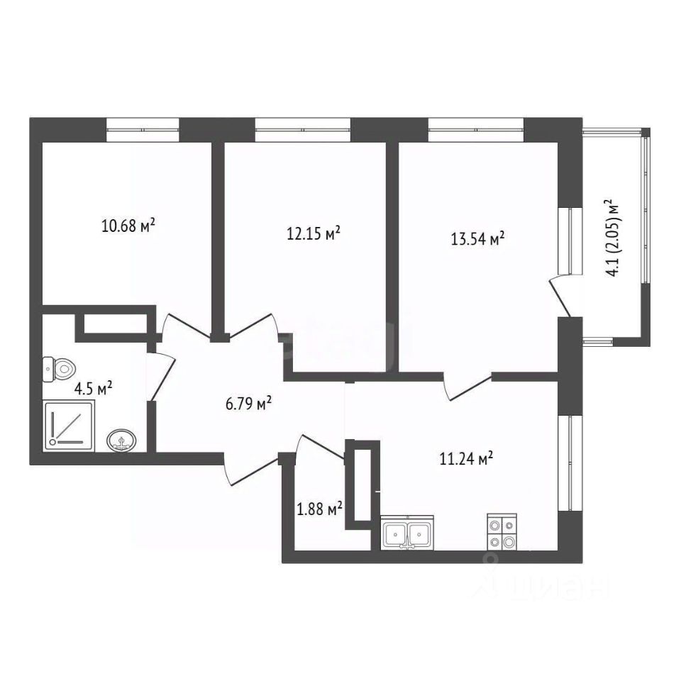 Планировка квартиры включает в себя две изолированные комнаты: спальня 12.1 кв.м, комната для подростка (кабинет) 10.7 кв.м, просторная кухня -гостиная площадью 25 кв.м. с выходом на лоджию 4 кв.м, и большая прихожая 6,8 кв.м.