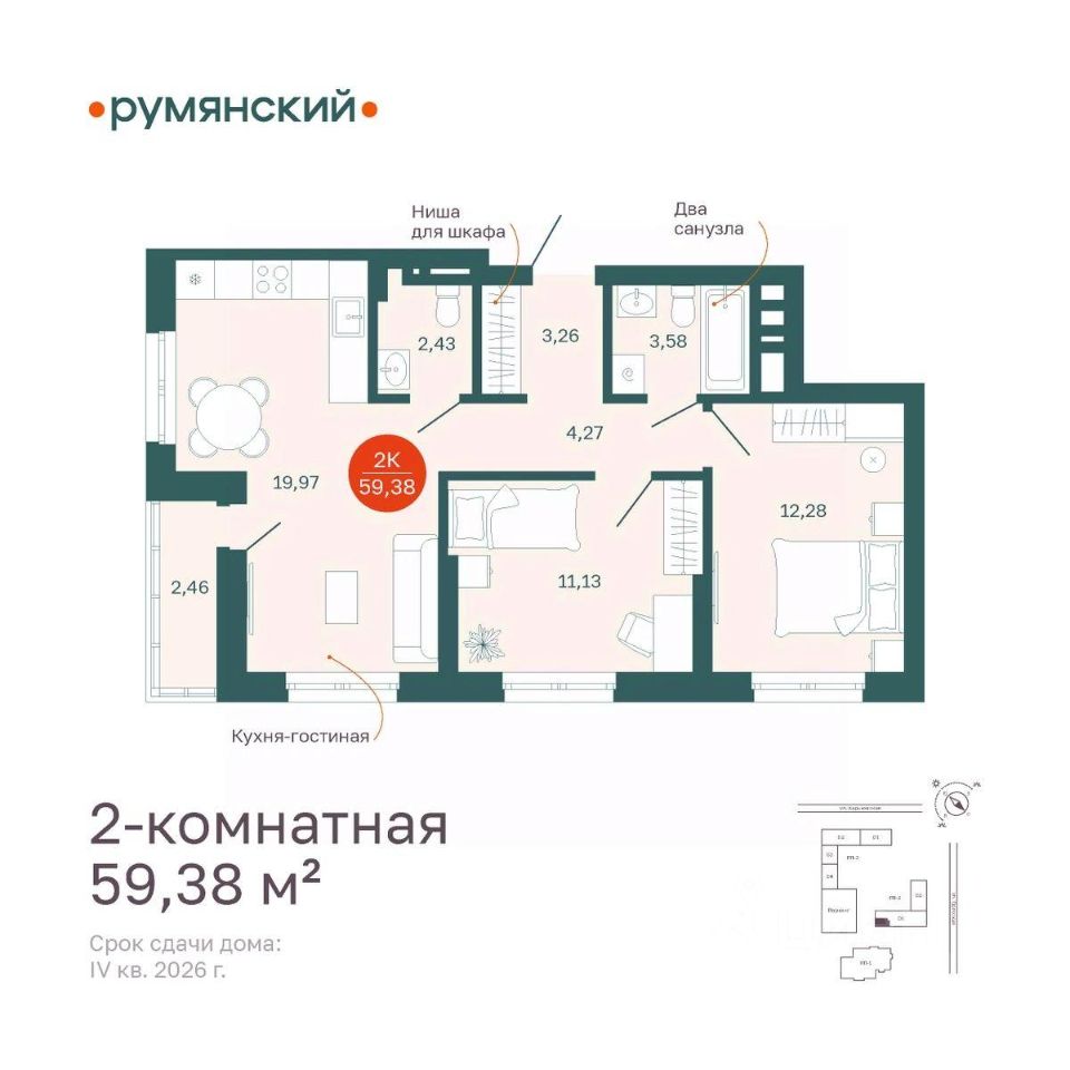Общая площадь59,38 м2