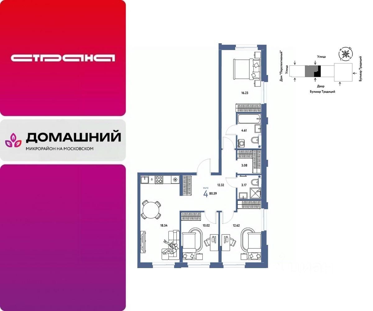 Продается 4комнатная квартира на 5 этаже от застройщика Страна Девелопмент. Площадь квартиры 80,59 кв. м.