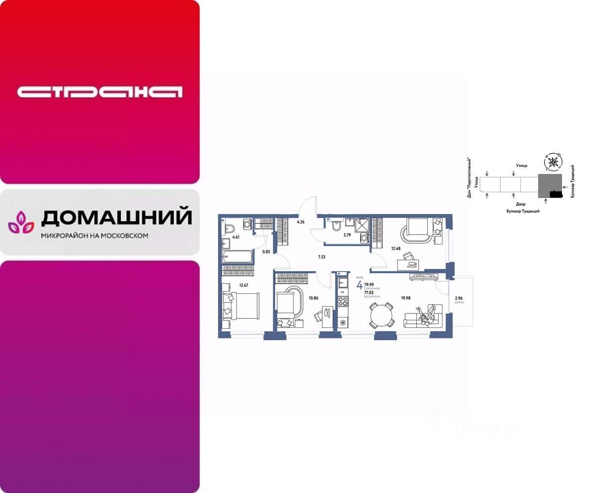 Продается 4комнатная квартира на 13 этаже от застройщика Страна Девелопмент. Площадь квартиры 80,1 кв. м.