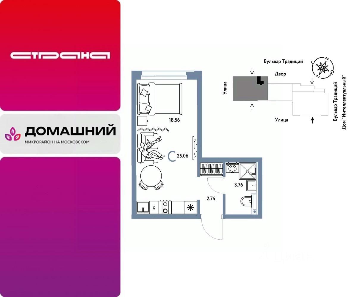 Продается 1комнатная квартира на 9 этаже от застройщика Страна Девелопмент. Площадь квартиры 25,06 кв. м. Стоимость указана без учета акций.