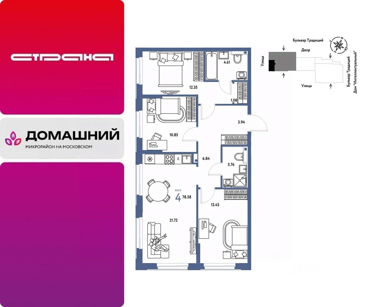 Продается 4комнатная квартира на 13 этаже от застройщика Страна Девелопмент. Площадь квартиры 78,58 кв. м. Стоимость указана без учета акций.