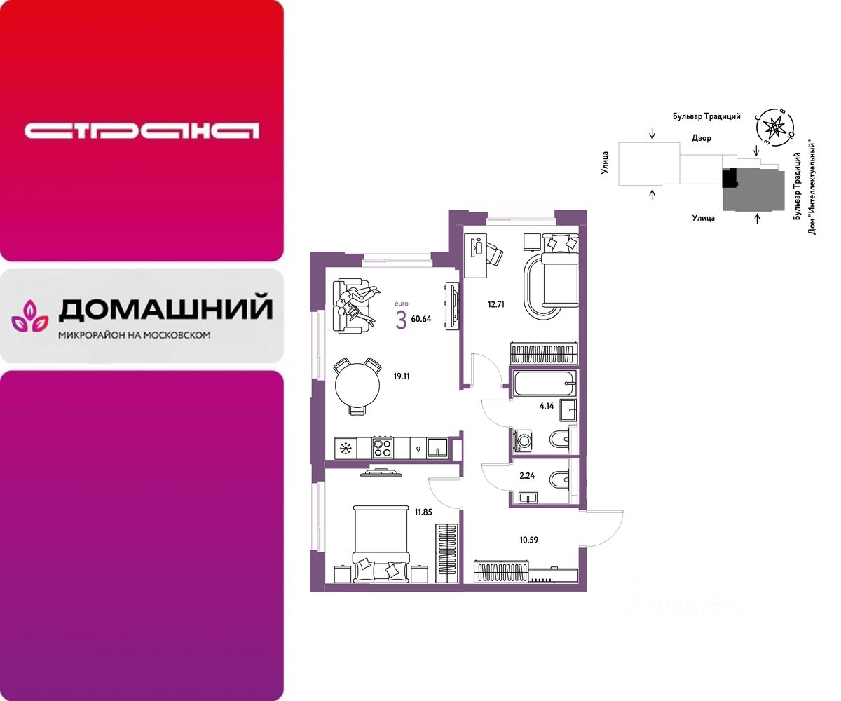 Продается 3комнатная квартира на 13 этаже от застройщика Страна Девелопмент. Площадь квартиры 60,64 кв. м. Стоимость указана без учета акций.