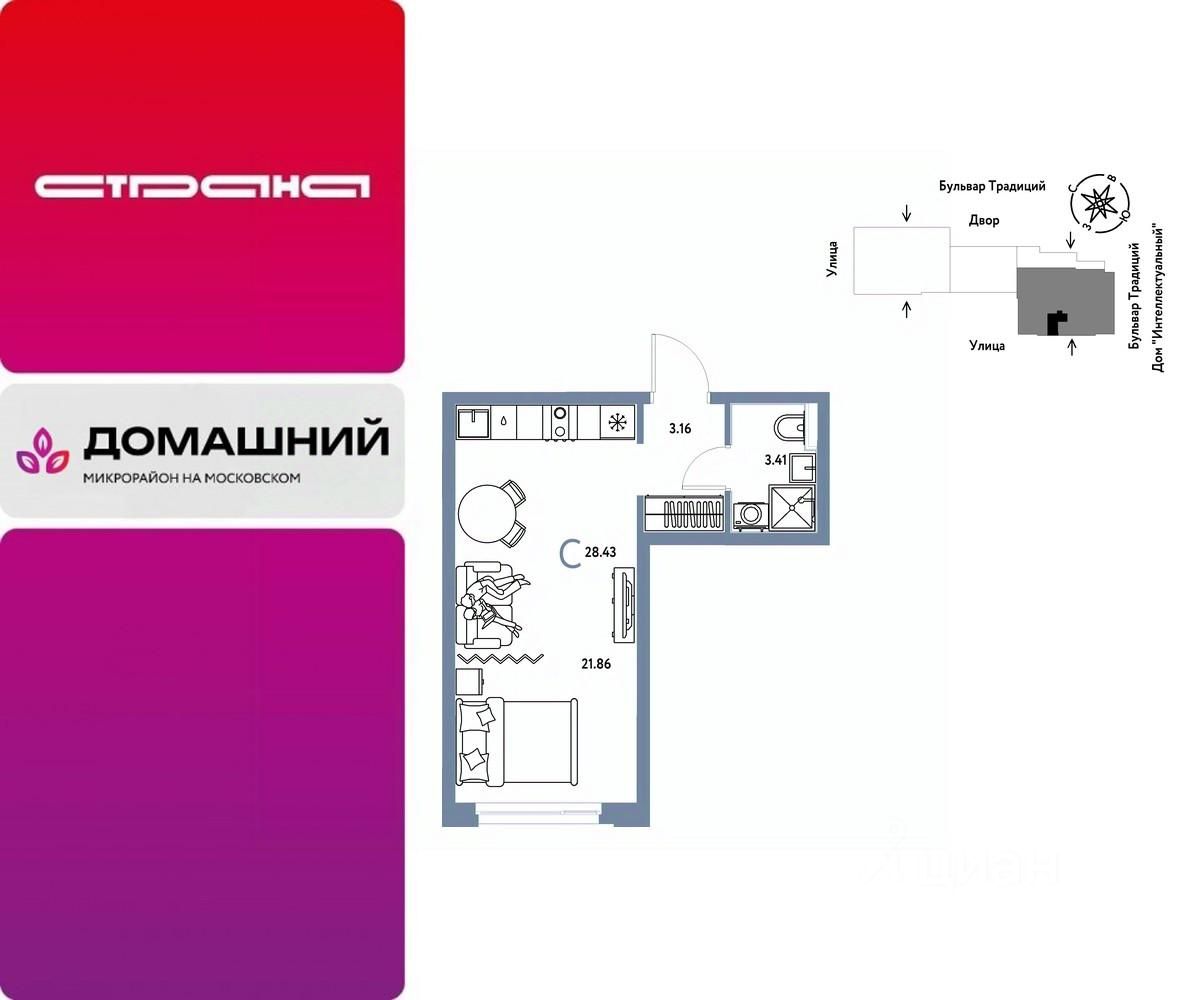 Продается 1комнатная квартира на 5 этаже от застройщика Страна Девелопмент. Площадь квартиры 28,43 кв. м. Стоимость указана без учета акций.