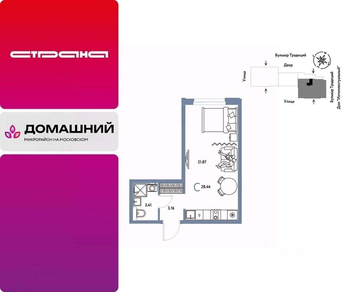 Продается 1комнатная квартира на 7 этаже от застройщика Страна Девелопмент. Площадь квартиры 28,44 кв. м. Стоимость указана без учета акций.