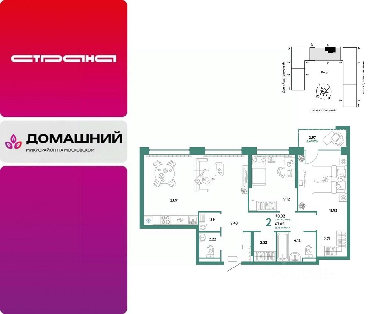 Продается 3комнатная квартира на 5 этаже от застройщика Страна Девелопмент. Площадь квартиры 70,02 кв. м.