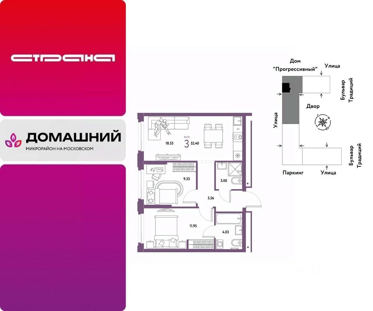 Продается 3комнатная квартира на 11 этаже от застройщика Страна Девелопмент. Площадь квартиры 52,4 кв. м.