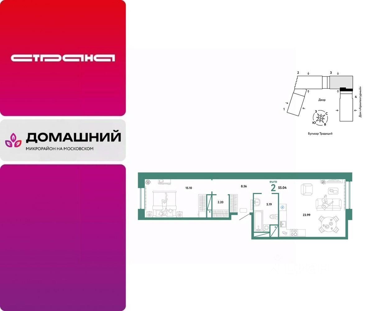 Продается 2комнатная квартира на 11 этаже от застройщика Страна Девелопмент. Площадь квартиры 55,04 кв. м.