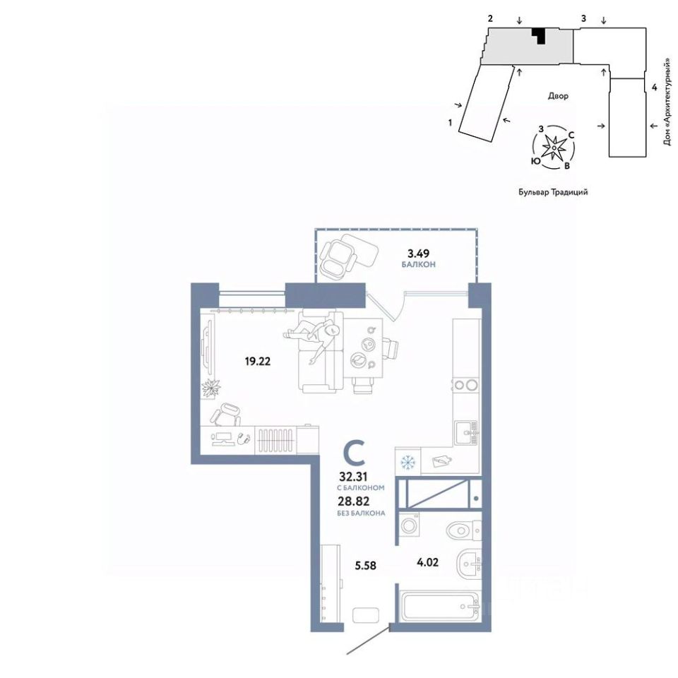 Продается 1комнатная квартира на 6 этаже от застройщика Страна Девелопмент. Площадь квартиры 32,31 кв. м. Стоимость указана без учета акций.