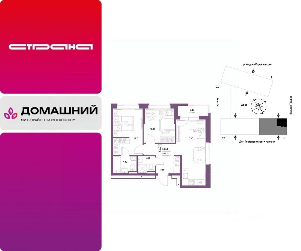Продается 3комнатная квартира на 2 этаже от застройщика Страна Девелопмент. Площадь квартиры 58,53 кв. м.