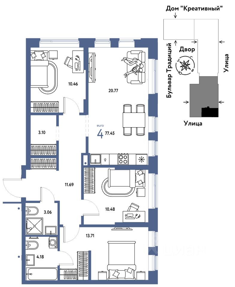 Продается 4комнатная квартира на 3 этаже от застройщика Страна Девелопмент. Площадь квартиры 77,45 кв. м.