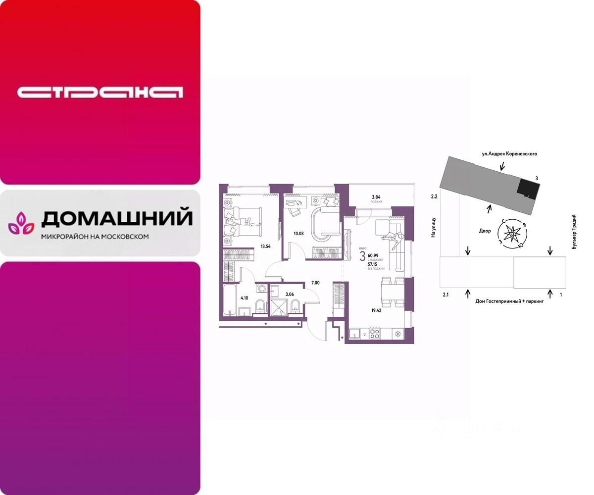 Продается 3комнатная квартира на 11 этаже от застройщика Страна Девелопмент. Площадь квартиры 60,99 кв. м.