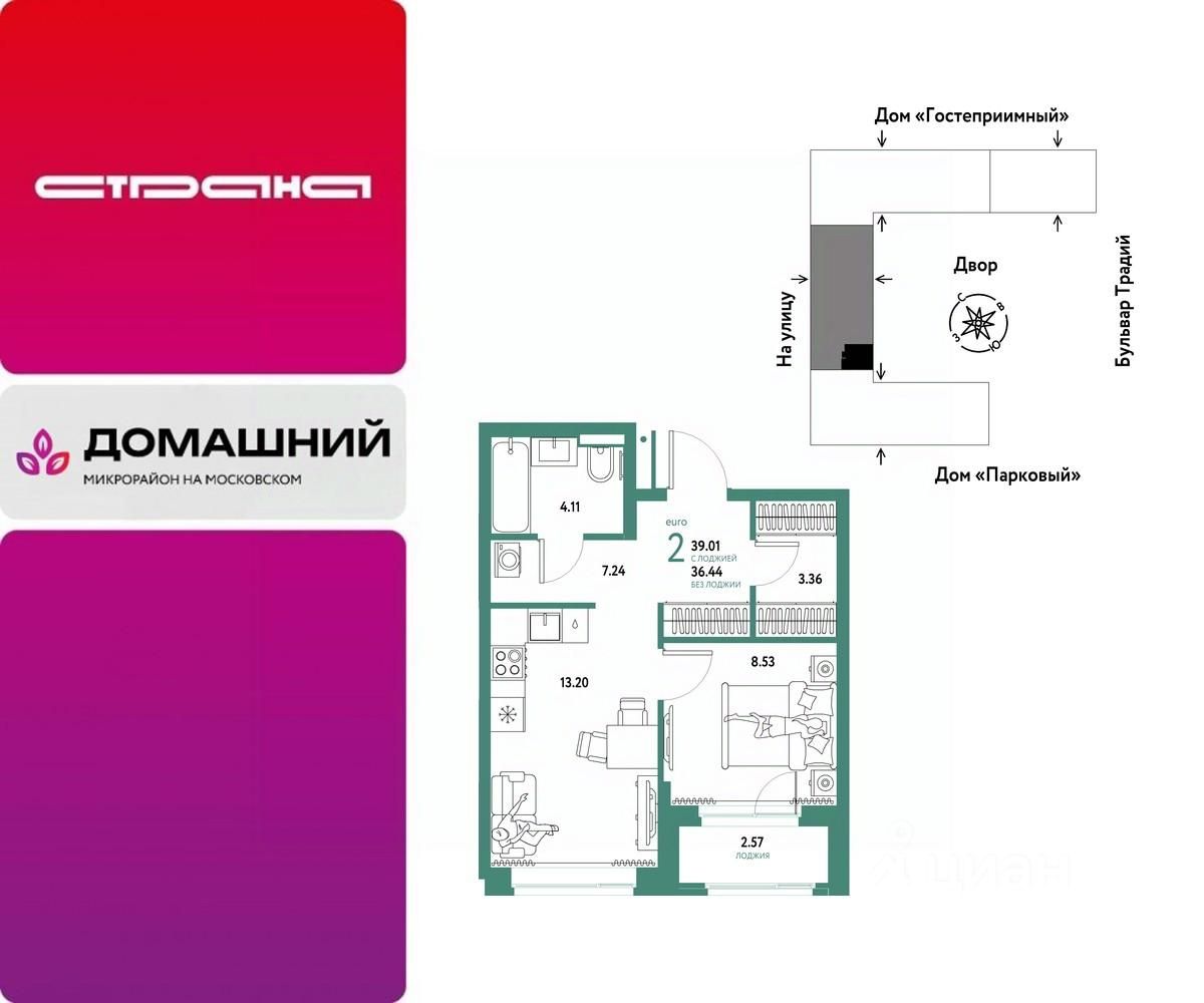 Продается 2комнатная квартира на 13 этаже от застройщика Страна Девелопмент. Площадь квартиры 39,01 кв. м.
