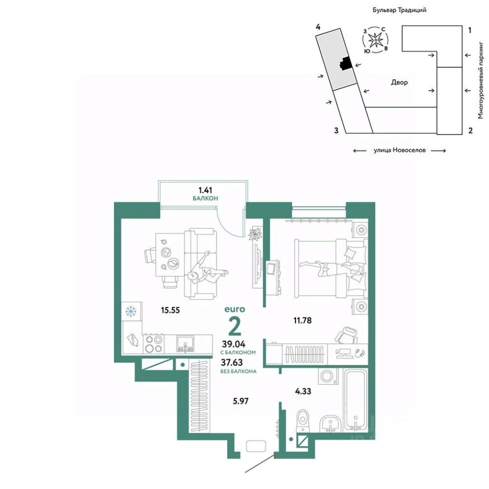 Общая площадь39,04 м2