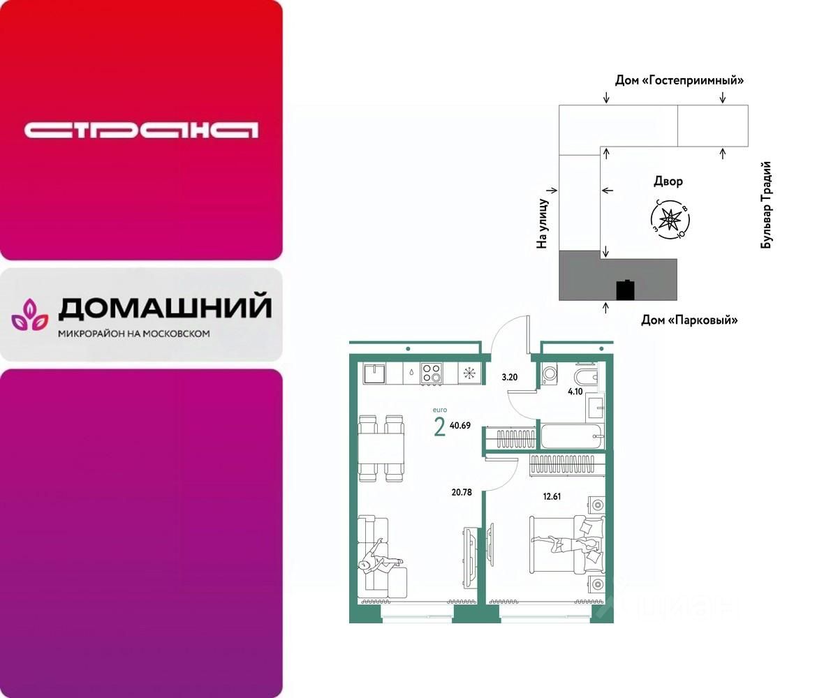Продается 2комнатная квартира на 7 этаже от застройщика Страна Девелопмент. Площадь квартиры 40,69 кв. м.