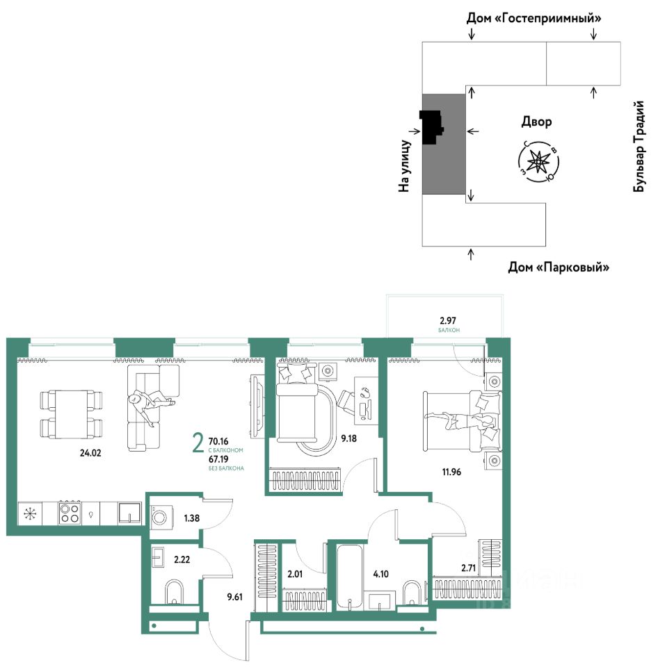 Продается 3комнатная квартира на 9 этаже от застройщика Страна Девелопмент. Площадь квартиры 70,16 кв. м.