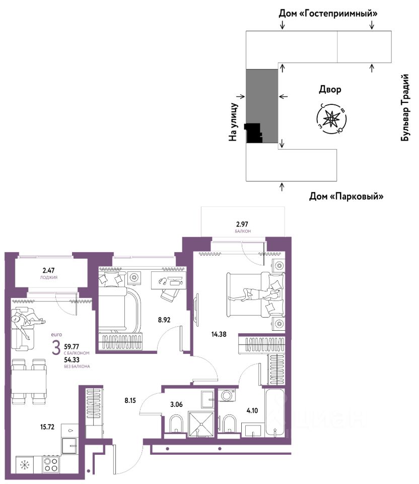 - Что входит в меблировку? - Кухня с техникой и сантехникой - Диван - Кровать - Шкаф в спальне - Шкаф в прихожей