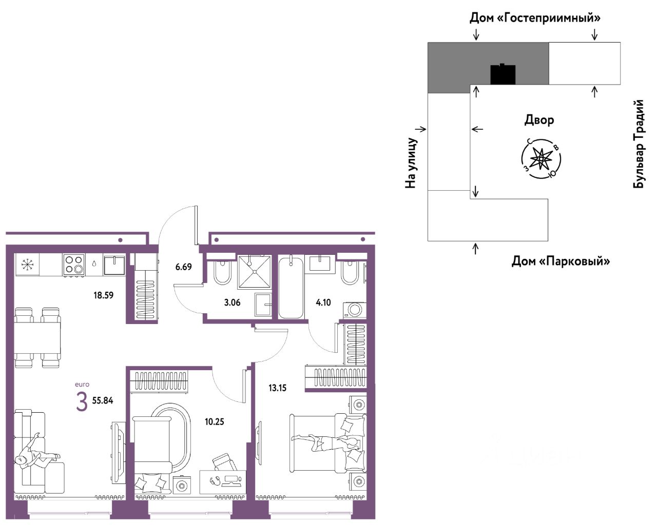 - Что входит в меблировку? - Кухня с техникой и сантехникой - Диван - Кровать - Шкаф в спальне - Шкаф в прихожей