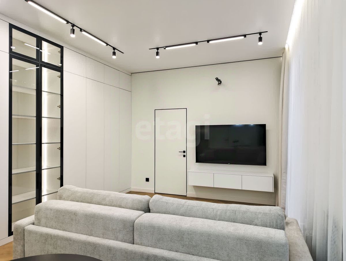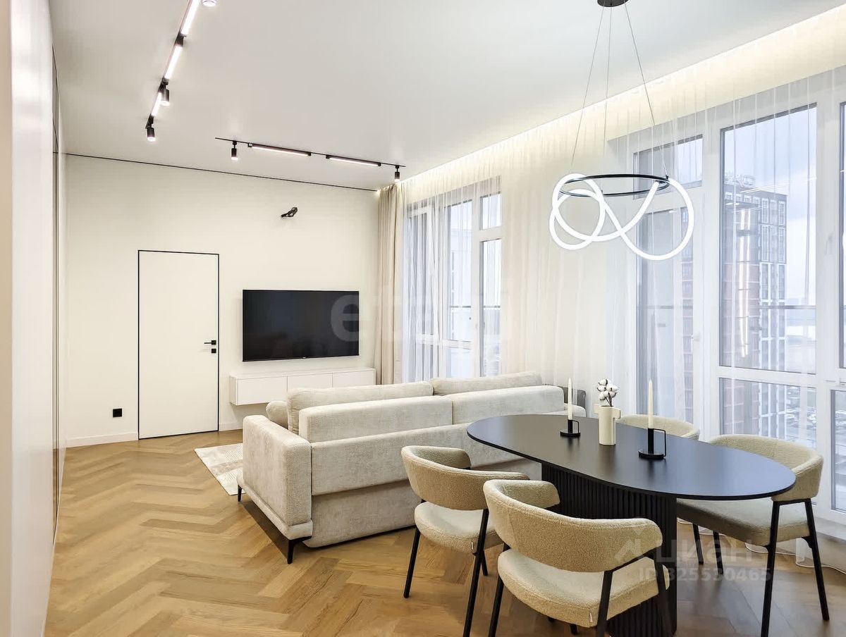 Планировка квартиры продумана до мелочей: просторная кухня-гостиная с большим диваном и ТВ-зоной, две отдельные спальни, одна из которых оборудована гардеробной системой. Входная зона включает вместительную прихожую со встроенными шкафами для удобного хранения вещей. Санузлов два — гостевой и основной с ванной, что обеспечивает комфорт для жильцов и гостей.