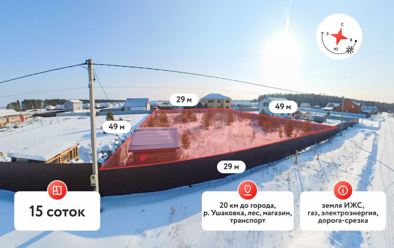Участок расположен в коттеджном поселке Ушаково, всего в 20 км от города Тюмень по Московскому тракту. Он имеет угловое расположение и находится на первой линии, что гарантирует, что перед вами ничего больше не построят.