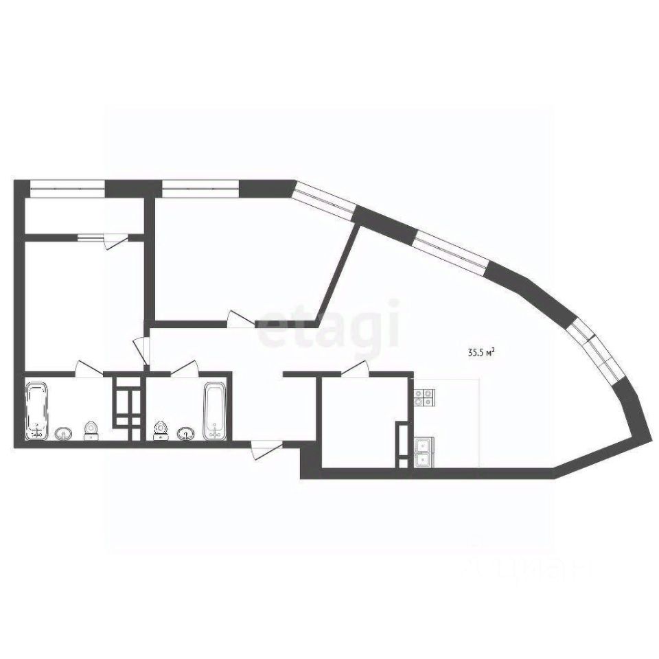 Общая площадь Объекта- 91 кв.м.(из них площадь жилой комнаты No 1 17,1 кв.м., жилой комнаты No 2 12,3 кв.м., площадь кухни/кухни-гостиной - 35,5 кв.м.,площадь сан.узла No 1 - 4,4 кв.м., площадь сан.узла No 2 - 4 кв.м., площадь подсобного помещения No1 5,9 кв.м., площадь коридора 5,6 кв.м., площадь коридора 2 4,3 кв.м.